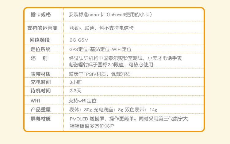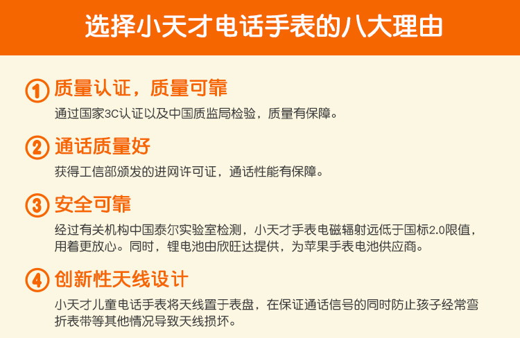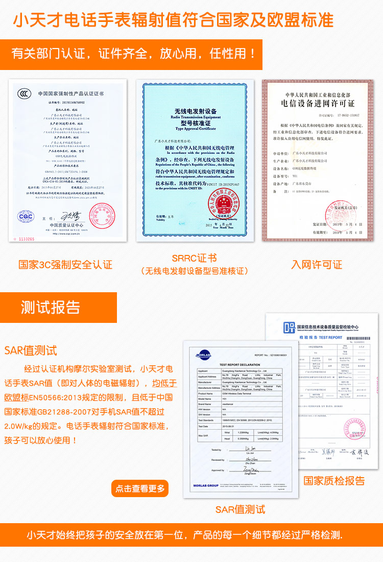 小天才电话手表通过国家3C认证和国家质监局检验,产品质量有保障。同时获得国家工信部颁发的进网许可证,通话质量有保障