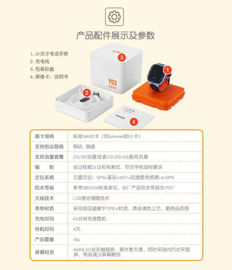 商品名称:新品小天才电话手表Y03快充版儿童定位智能手表手环学生手机