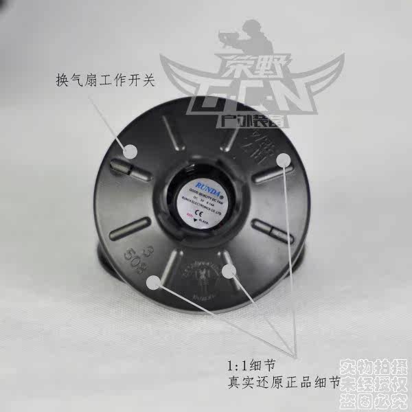 按动“滤毒罐”后侧的延时开关,便可启动风机对面具内进行气流循环,迅速排汗防雾。每次开启运行8分钟电路便自动关闭以防止玩家游戏结束后忘记关闭而造成损坏,停止后可继续按动开关启动也可中途按动开关停止。不使用时无需取出电池,待机工作电流处于休眠状态(小于5VA)