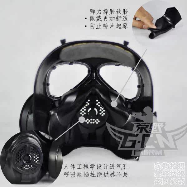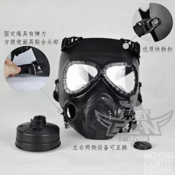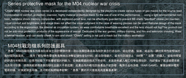 “酋长”MO4核战危机系列是结合近年热门游戏电影,以生化战士的形象为基础。打造出的第一款生化防毒式的防护面具,面具使用轻型绿色环保抗冲击复合材料,无毒无味无刺激人体可安全接触。眼部采用了防爆镜片,能有效的防止“BB弹”“彩弹”的射入。并首次采用了内部气流循环系统迅速排汗防雾,使得佩戴舒适,透气性极佳且镜片不易起雾!注意:此产品为外观性防护产品不能防毒。专用于生存游戏(WAR GAME),军事训练和电影电视拍摄。使用时可佩戴眼镜,头盔,耳机,并可做到贴腮瞄准射击!