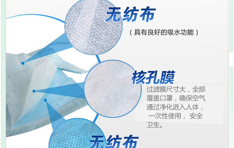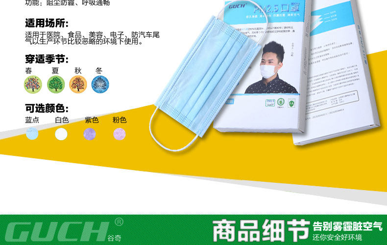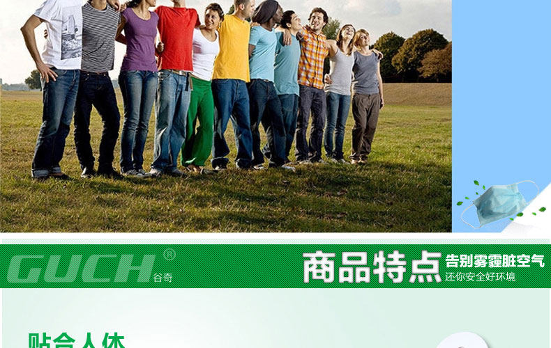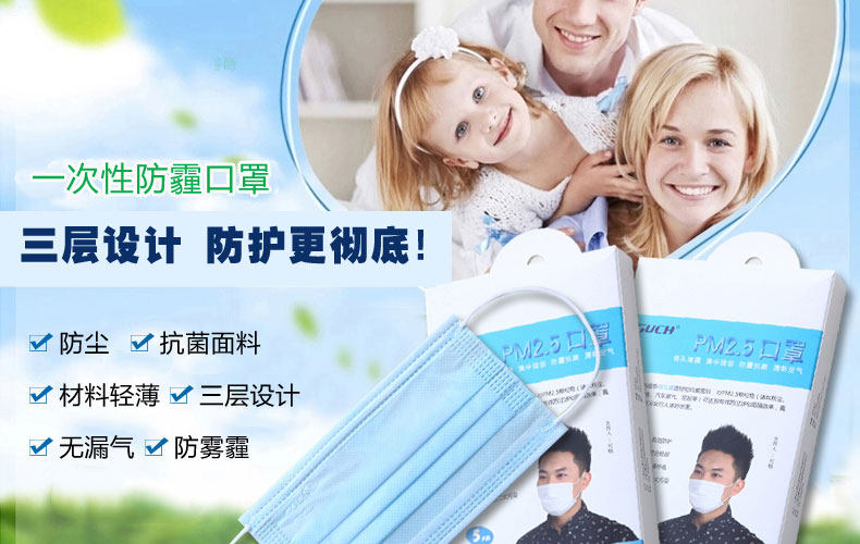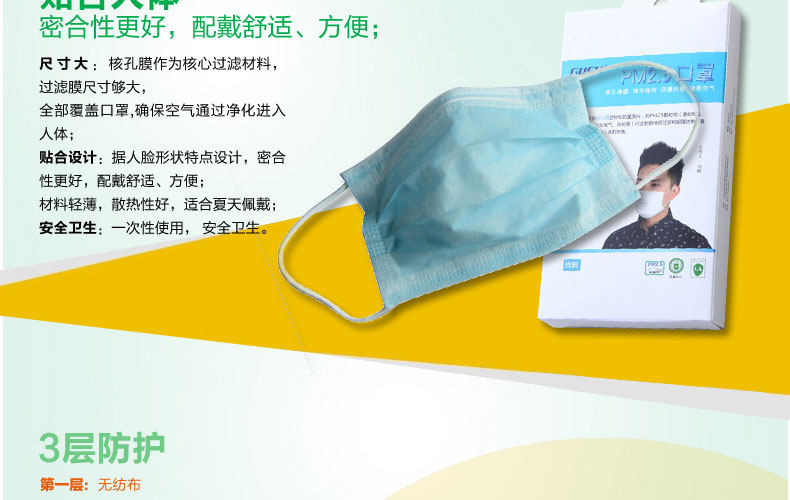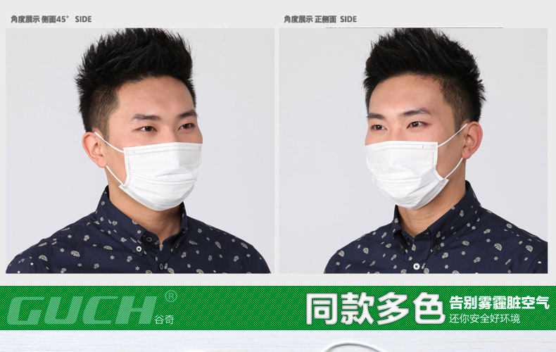 本款为一次性防霾口罩,根据人脸形状特点设计,材质亲肤,密合性好,佩戴舒适,方便,卫生,防霾无死角。