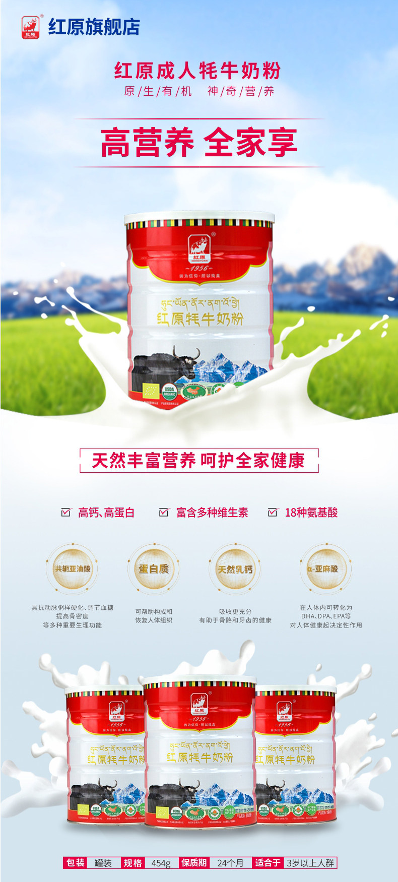 商品名称:红原牦牛奶粉 全脂高钙成人有机奶粉 高原天然全家有机奶粉 454g