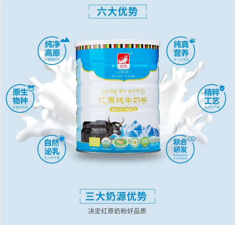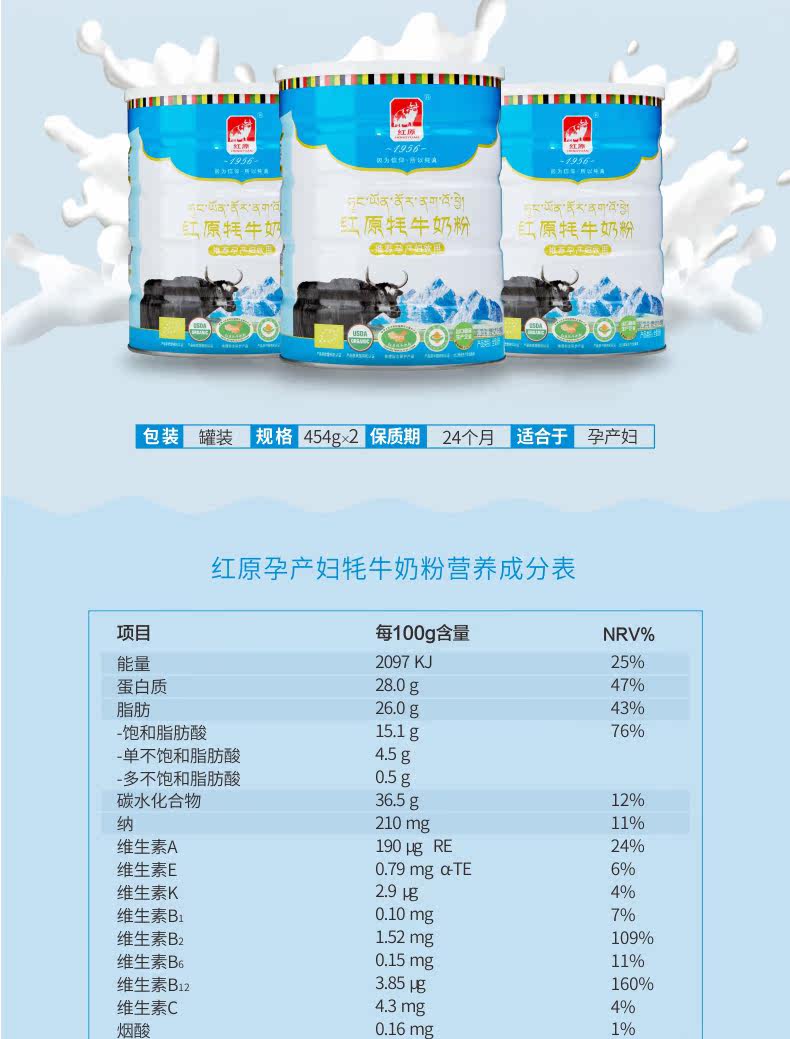 商品名称:红原牦牛奶粉 有机纯牦牛奶粉 孕产妇奶粉 全脂组合装454g*2罐