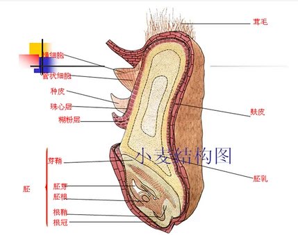 麦仁属于小麦颖果,长圆形,两端略尖,长至6mm,直径1.5~2.5mm。表面浅黄棕色或黄色,稍皱缩,腹面中央有一纵行深沟。质硬,断面白色,粉性。气弱,味淡,有时带有未脱净的颖片及麸。