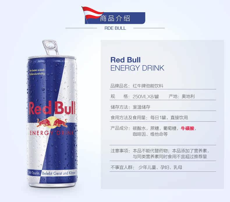 商品名称:Redbull/红牛 奥地利原装进口维生素功能饮料250ml 8罐起包邮