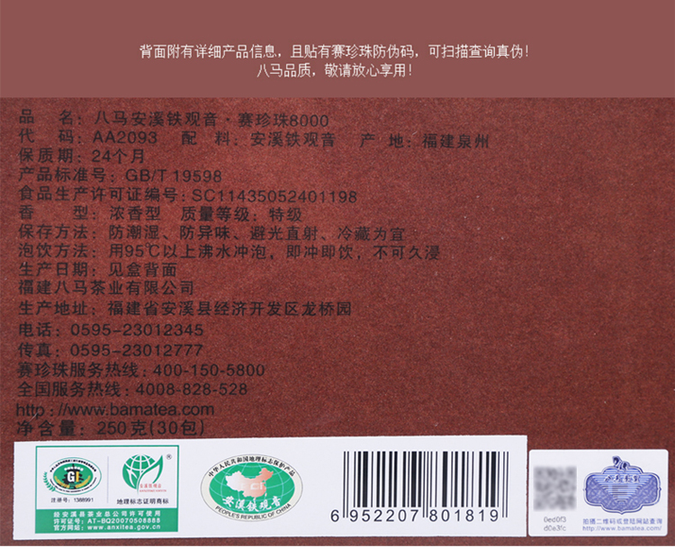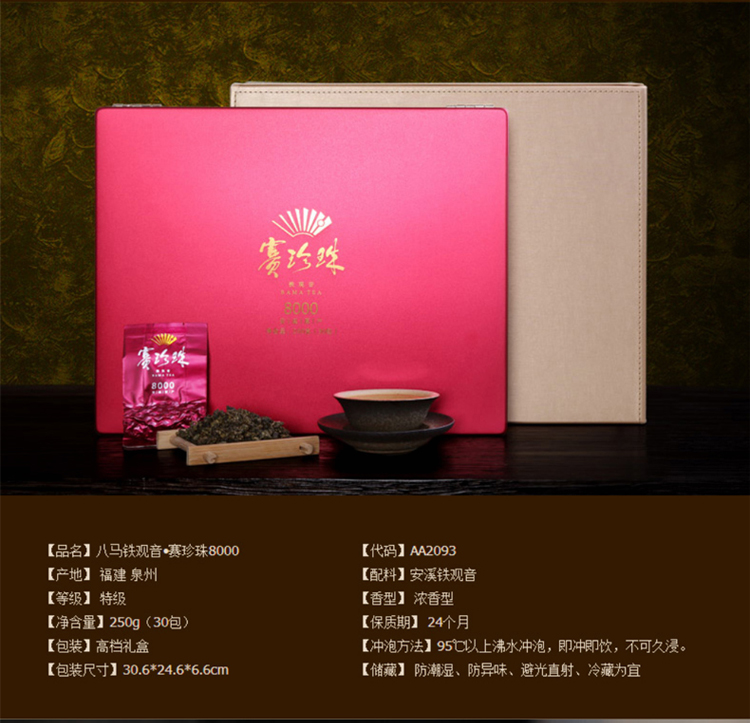 商品名称:八马茶业 安溪铁观音 赛珍珠8000 浓香型 新包装 乌龙茶 特级 礼盒装 250克