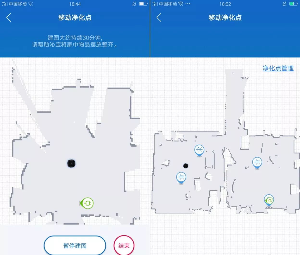 如果用户不满意机器设定的净化点,比如净化点设定在洗手间,那可以删除已有净化点,创建新的净化点,最多可设置四个净化点。